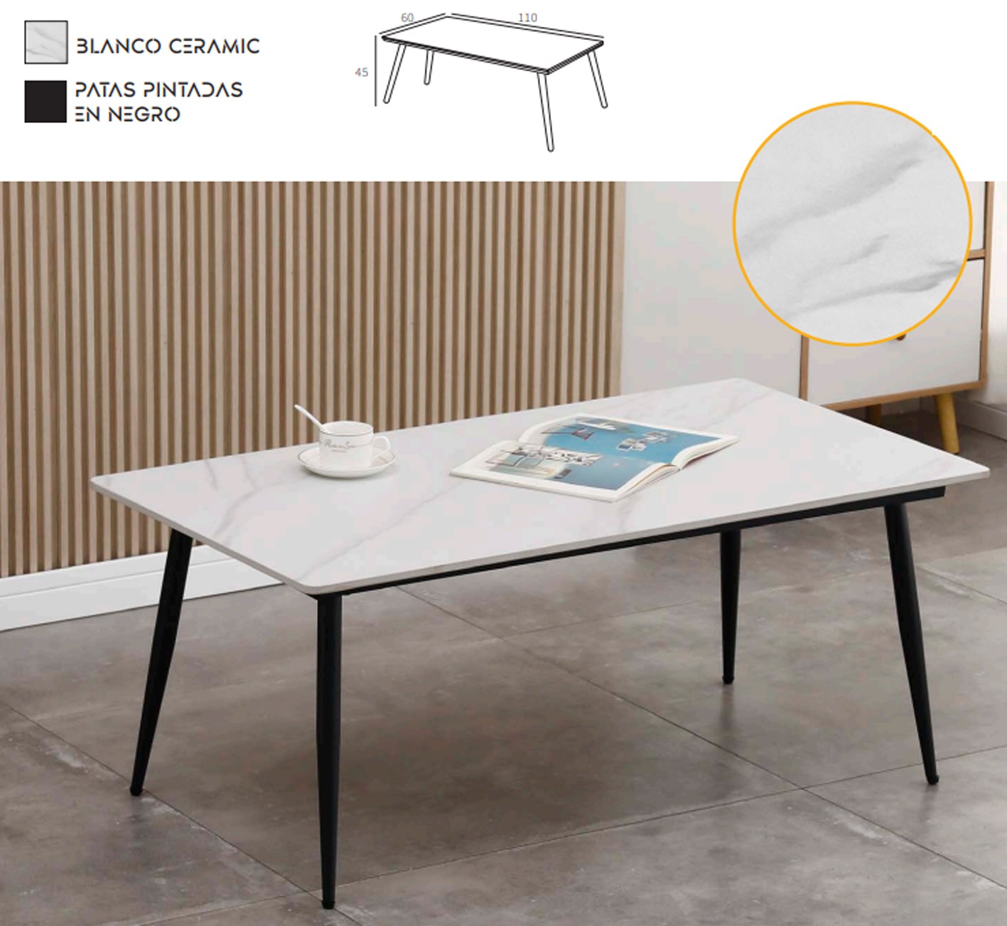 Mesa de centro, modelo ELVIRA, tapa cerámica de 12mm imitando mármol, pata METALICA acabado negro Regulador en las patas Medidas: ancho 110x fondo 60 x alto 45