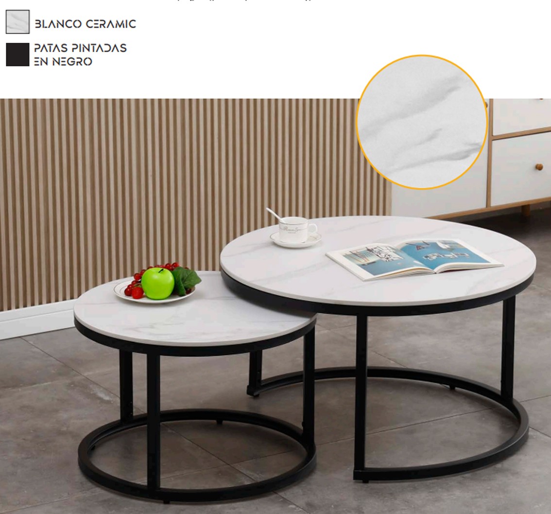 Set de dos mesas de centro, modelo ELVIRA, tapa cerámica de 12mm imitando mármol, pata METALICA acabado negro Regulador en las patas Medidas: ALta — 80x alto 41 baja — 60x alto 37