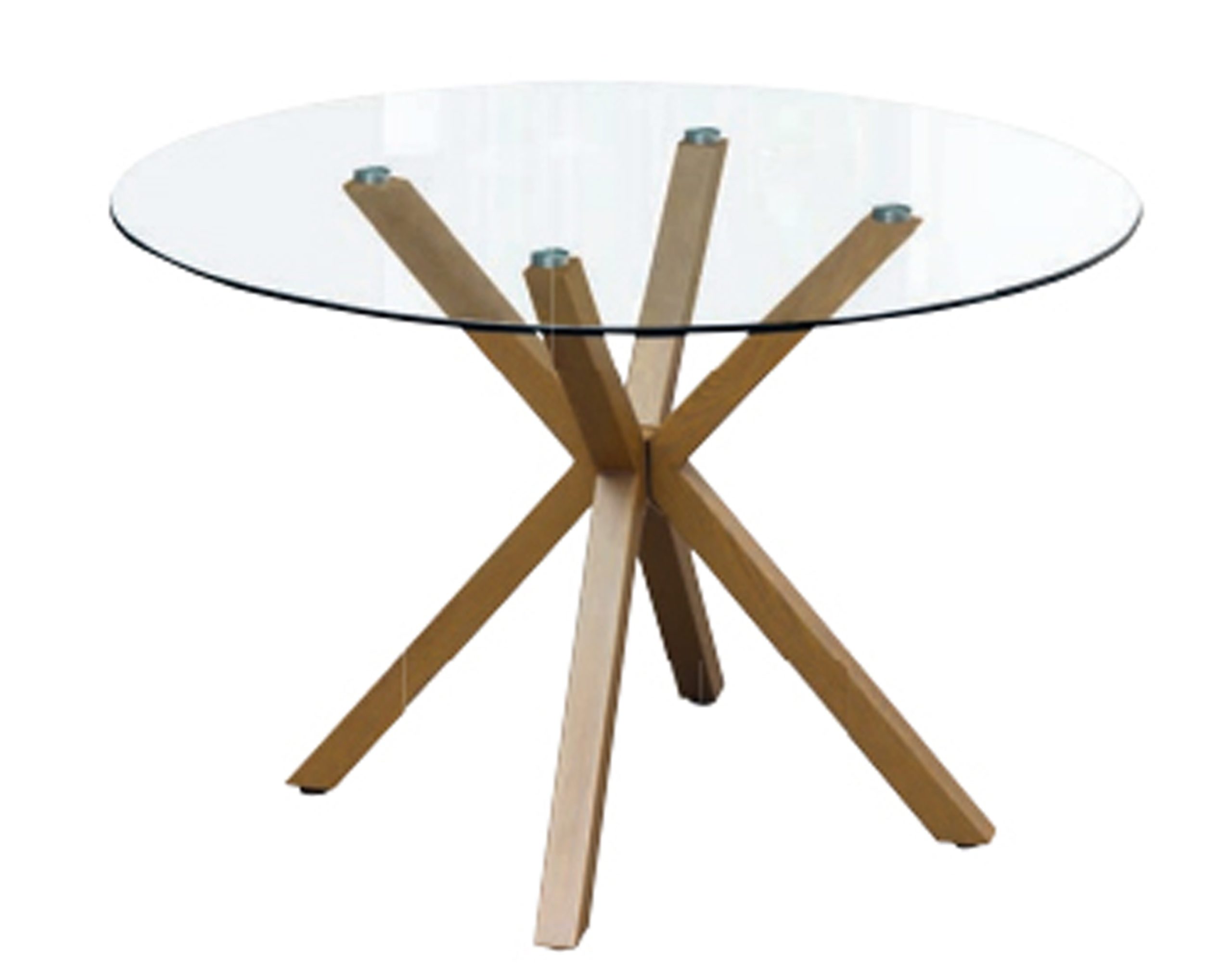 Mesa comedor de cristal transparente redonda de 114 cm de diámetro con pata metálica con reguladores de estabilidad en acabado nature
